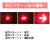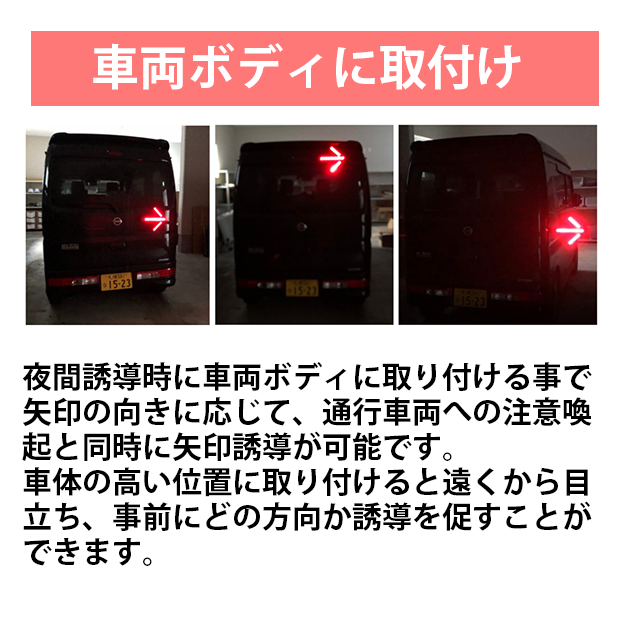 夜間誘導時に車両ボディに取り付ける事で、矢印の向きに応じて通行車両への注意喚起と同時に矢印誘導が可能です。